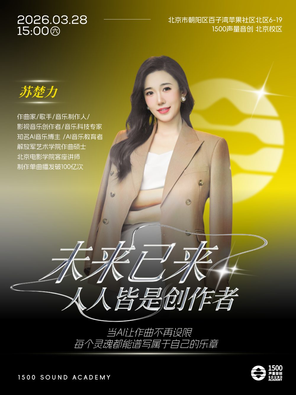 1500声量音程联合百亿单曲制作人苏楚力老师,重磅打造《未来已来·人人皆是创作者》大咖讲座,重磅揭秘AI音乐的过去与未来,趋势与挑战,带你彻底击碎AI焦虑,触摸另一种未曾展开的未来